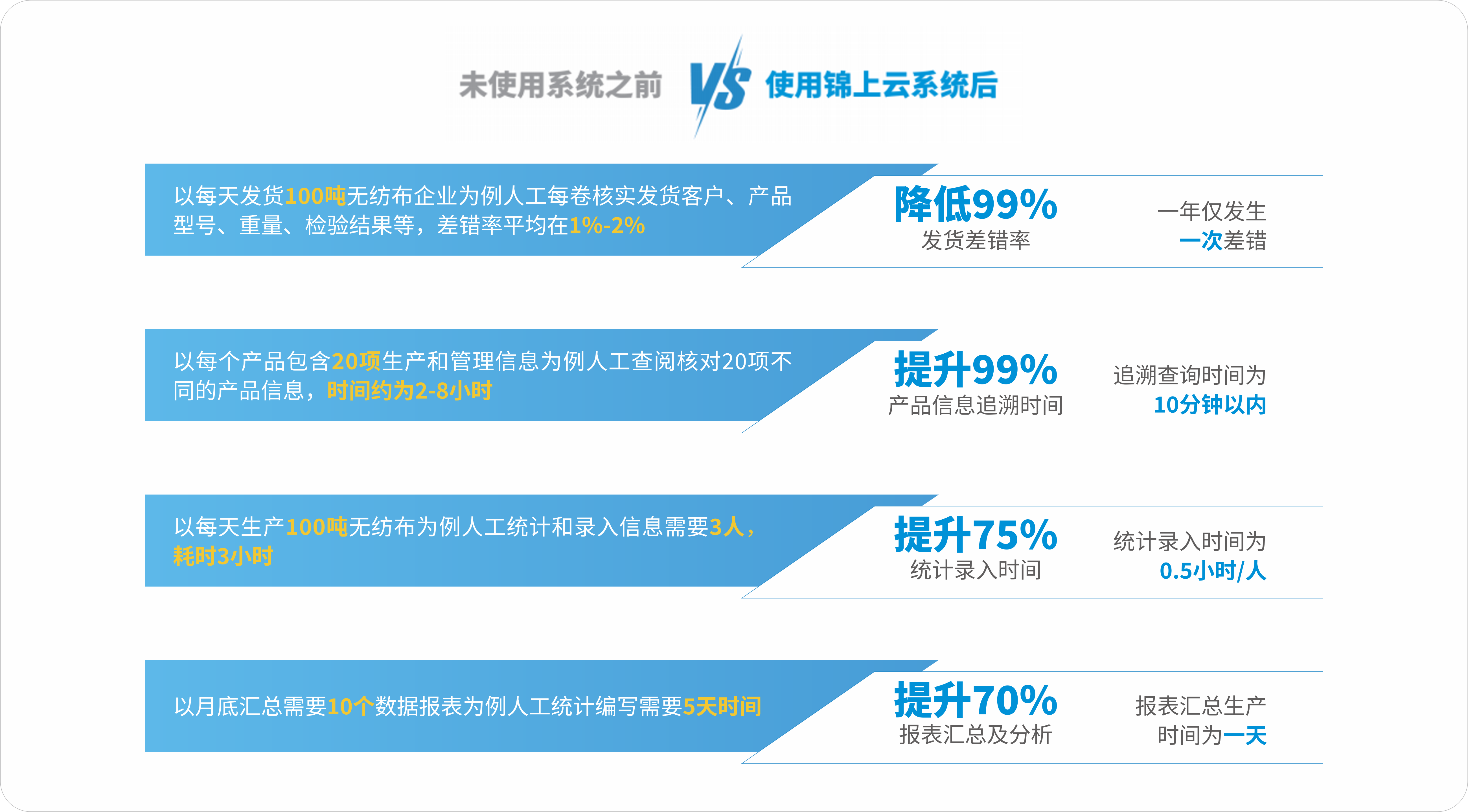 锦上云-非织造企业数字化管理系统是由多位行业专家和资深的开发团队用了10年时间不断应用及实践打磨出来的一款专门针对非织造布行业的企业管理软件,汇聚了15年以上的经验的行业专家及25年开发经验的开发团队。聚焦于智慧工厂/数字化工厂的建设,我们不懈的为提升非织造企业数字应用的价值,始终为非织造企业带来信息化-数字化-智慧化的一体化解决方案。拥有锦上云-纺粘版,锦上云-熔喷版,锦上云-针刺版,锦上云-短浅版等非织造行业管理系统。